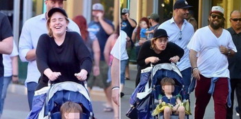 At first blush, she looks just like any other mom pushing around an excited toddler in a stroller but taking a closer look we see that it is, in fact, Adele he is indeed sporting a Princess Anna costume.