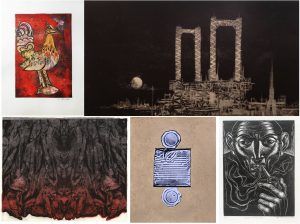 Some of the original works of Master Artists and Printmakers seen on the Limbag Kamay Contemporary Print Fair (Clockwise): Virgilio “Pandy” Aviado’s “Sarimanok”; Juvenal Sanso’s “Port Moderne”; Elmer “Emong” Borlongan’s “Old Man Smoking A Pipe”; Mars Bugaoan’s “Empty Tin Can No. 2”; and Lenore RS Lim’s Untitled (Red) from the Comfort Women Series
