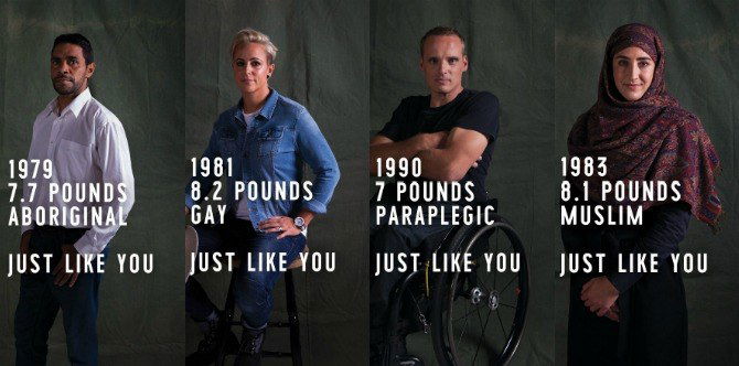 The campaign features photos of four different minority groups that are often targets of prejudice. It features an Islamic woman, a paraplegic man, an Aboriginal man, and a gay woman. It also shows their year of birth, their weight at birth, as well as the words “Born Just Like You”.