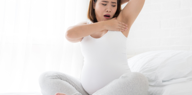 There are two hormones that cause this: progesterone and estrogen, as well as a hormone that is created from the placenta, which is hCG. All of these cause the mother’s body to develop dark spots, not just in the armpits, but also on the neck, elbows, knees, and groin. Some people may find that there are not only dark spots, but also itching and odor.