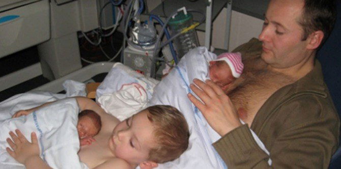 Parents all over the world are gushing about a photo of a father and son lovingly practicing skin-to-skin contact with newborn twins.