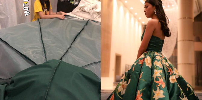 Inabot raw siya ng 2 linggo, kasama na ang pag-paint ng mga bulaklak sa skirt ng gown niya. Siya raw ang nakaisip ng design, pati na ang nagtahi ng gown. Pero tinulungan rin daw siya ng kaniyang ina pagdating sa pagtatahi.