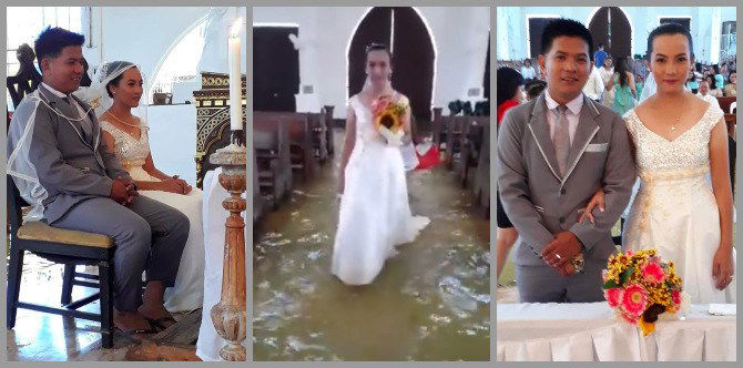 Dahil hanggang loob ng simbahan ang tubig, tinanggal ng bride, groom, at mga entourage ang kani-kanilang mga sapatos at nag-tsinelas na lang. Ang iba ay nagyapak na lang.