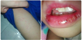 - Swollen, red, cracked lips, and tongue