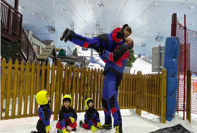 (L-R) Gavin, Kendra, and Scarlett with parents Cheska and Doug during a trip to Dubai where they enjoyed skiing.