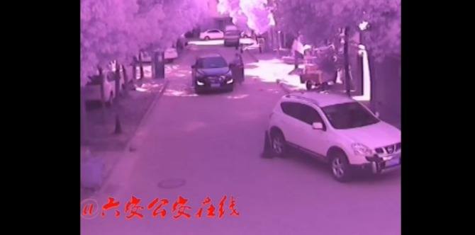 The horrific scene was captured by a CCTV camera in a residential area in Anhui Province, eastern China.